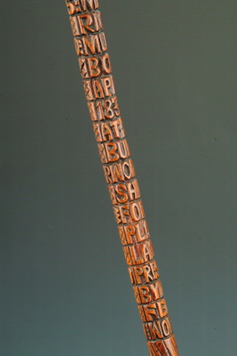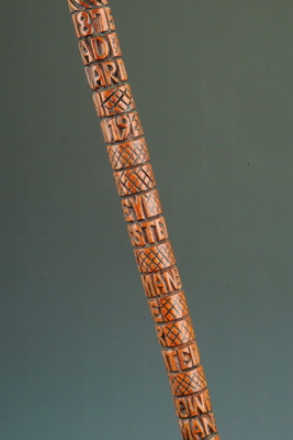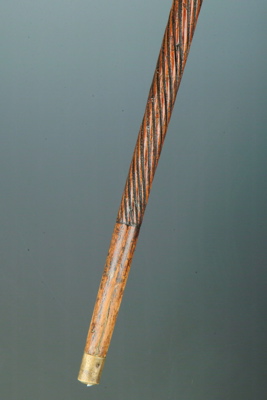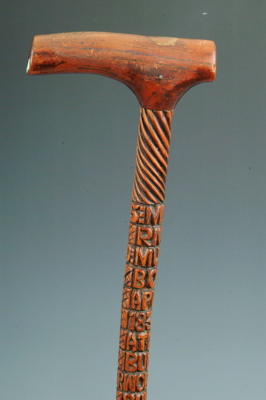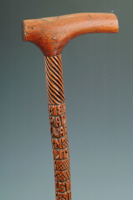 A fine, interesting and early carved and inscribed folk art cane, with deeply carved inscriptions around the shaft and fitted with a matching wooden tau-shaped handle - the shaft with fine spiral carving above and below the inscription, which reads "1875 MR RICHAD [sic] MULLARD BORN APRIL 19 1833 AT BUDLEY WORCESTERSHIRE FOREMAN PLATE LAYER PRESENTED BY A FELLOW WORKMAN"
