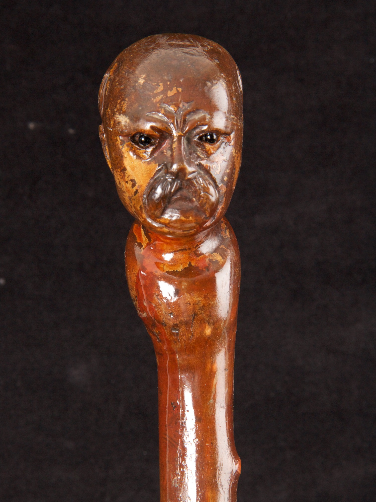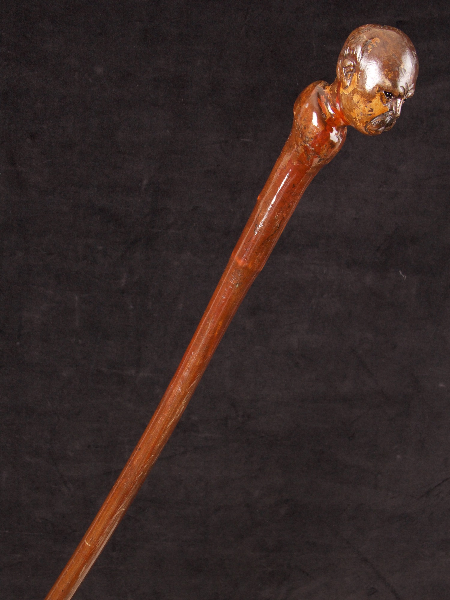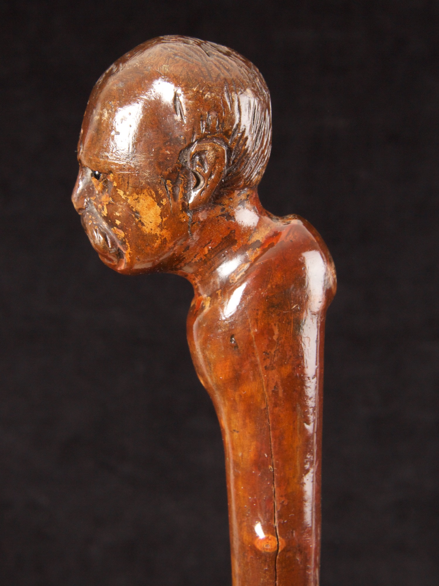 A decorative Victorian one-piece wooden walking cane - of rich patina overall - the handle modelled as the face of statesman, with the remains of some painting, and small inset glass eyes - the cane shaft finished with a worn metal ferrule
