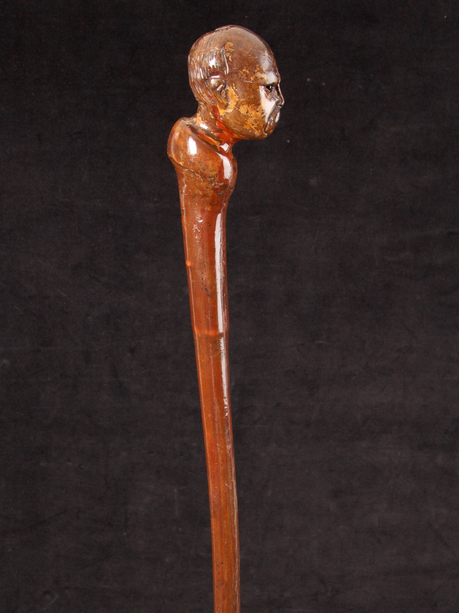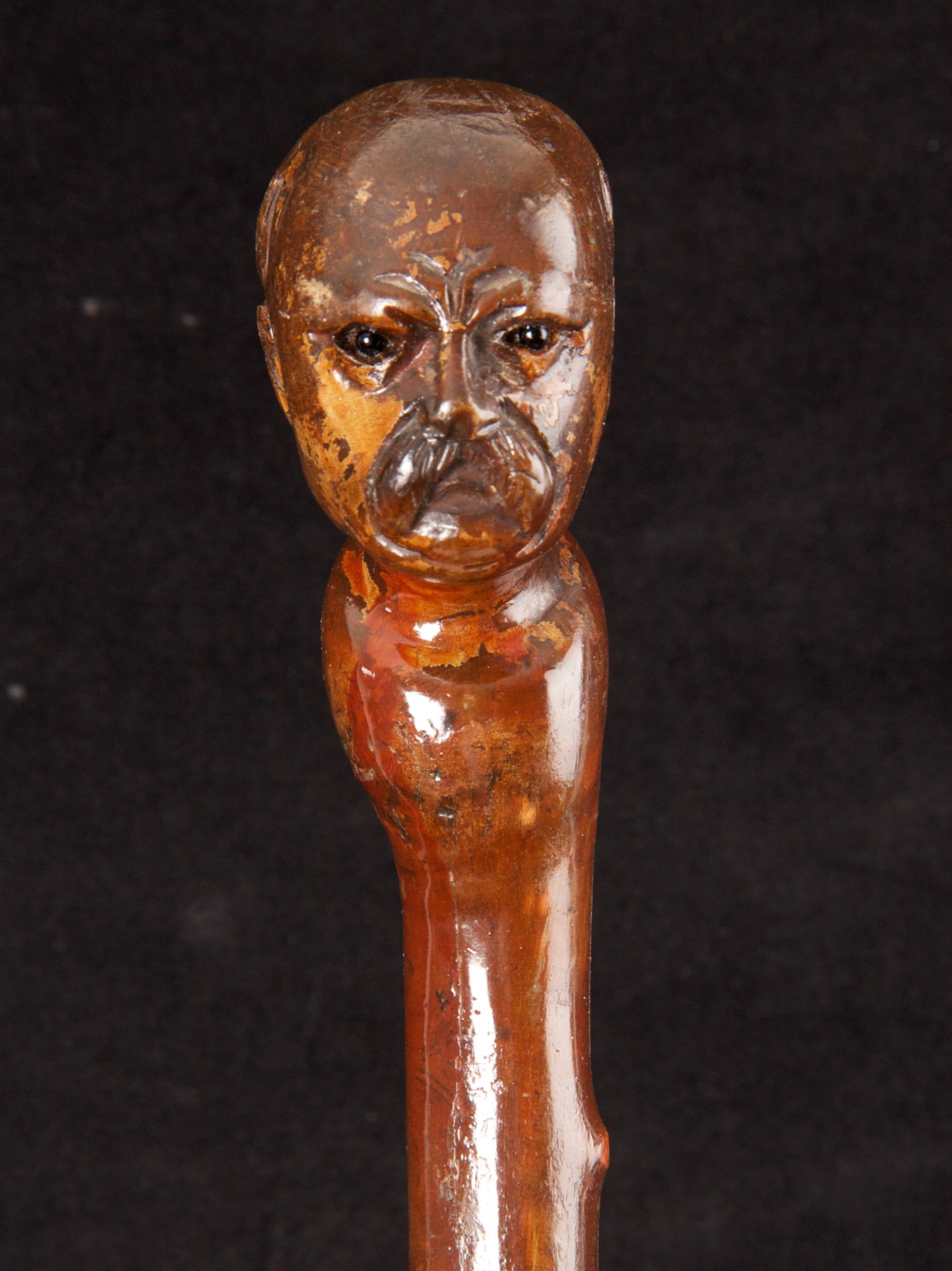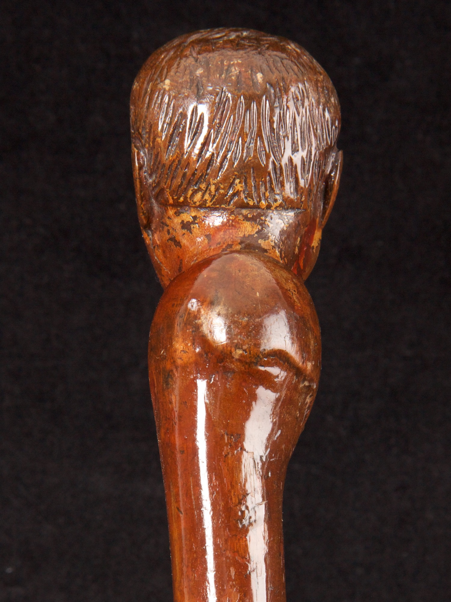 A decorative Victorian one-piece wooden walking cane - of rich patina overall - the handle modelled as the face of statesman, with the remains of some painting, and small inset glass eyes - the cane shaft finished with a worn metal ferrule