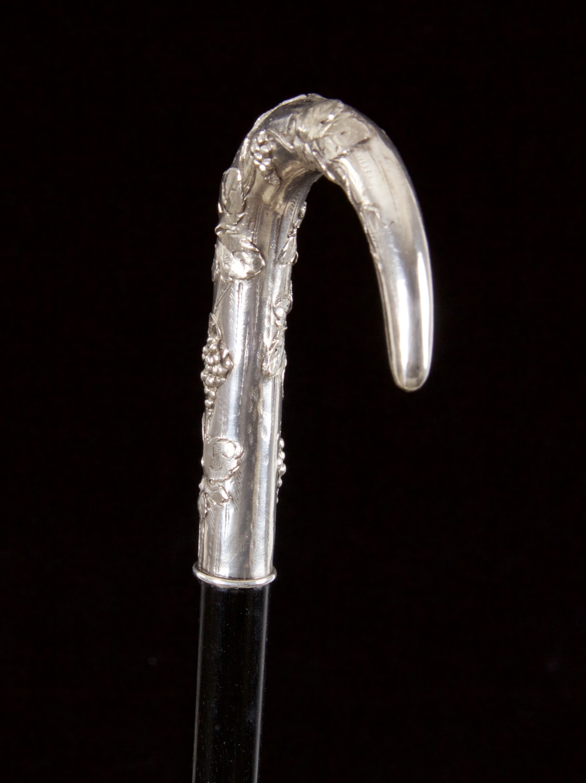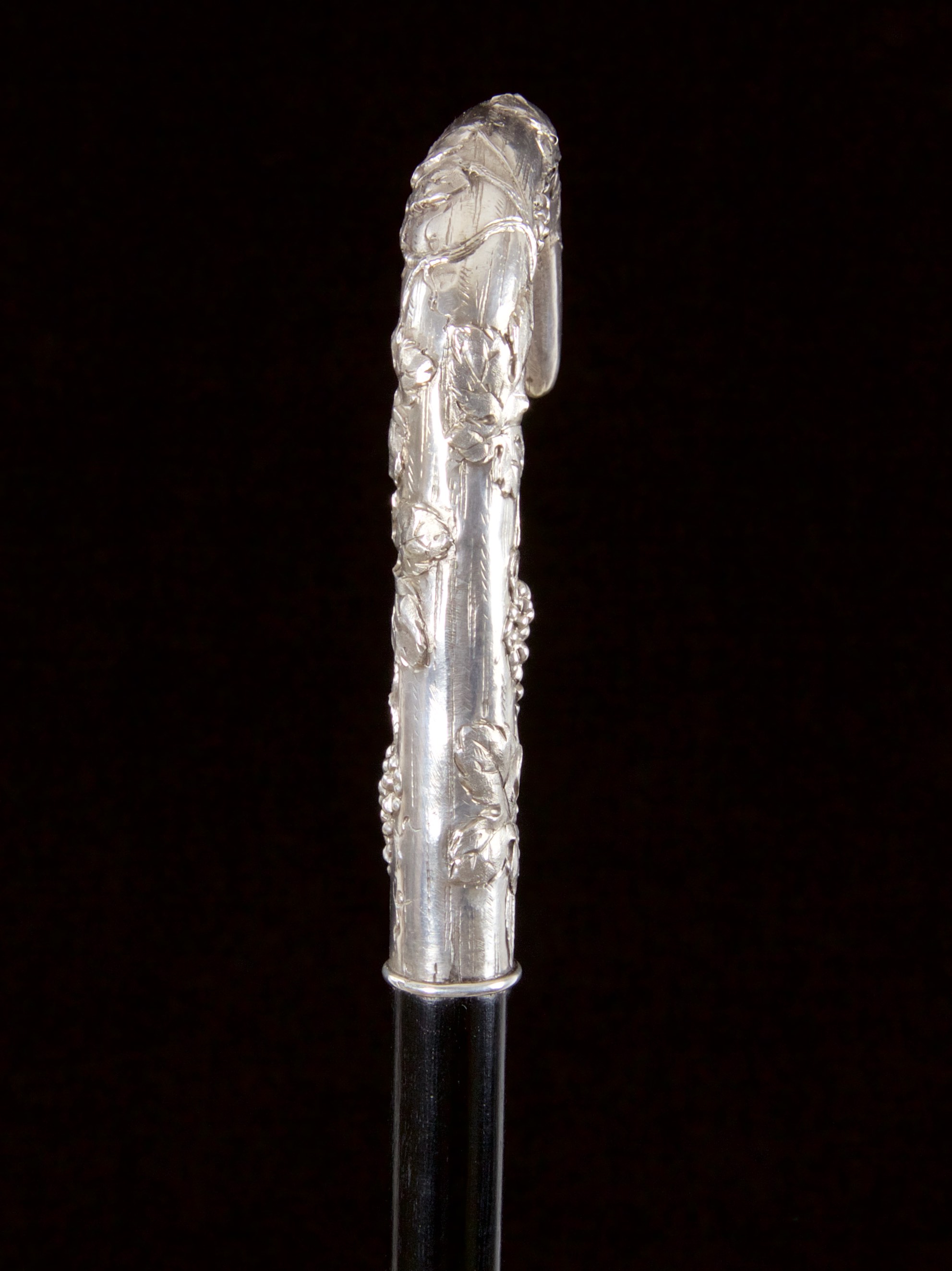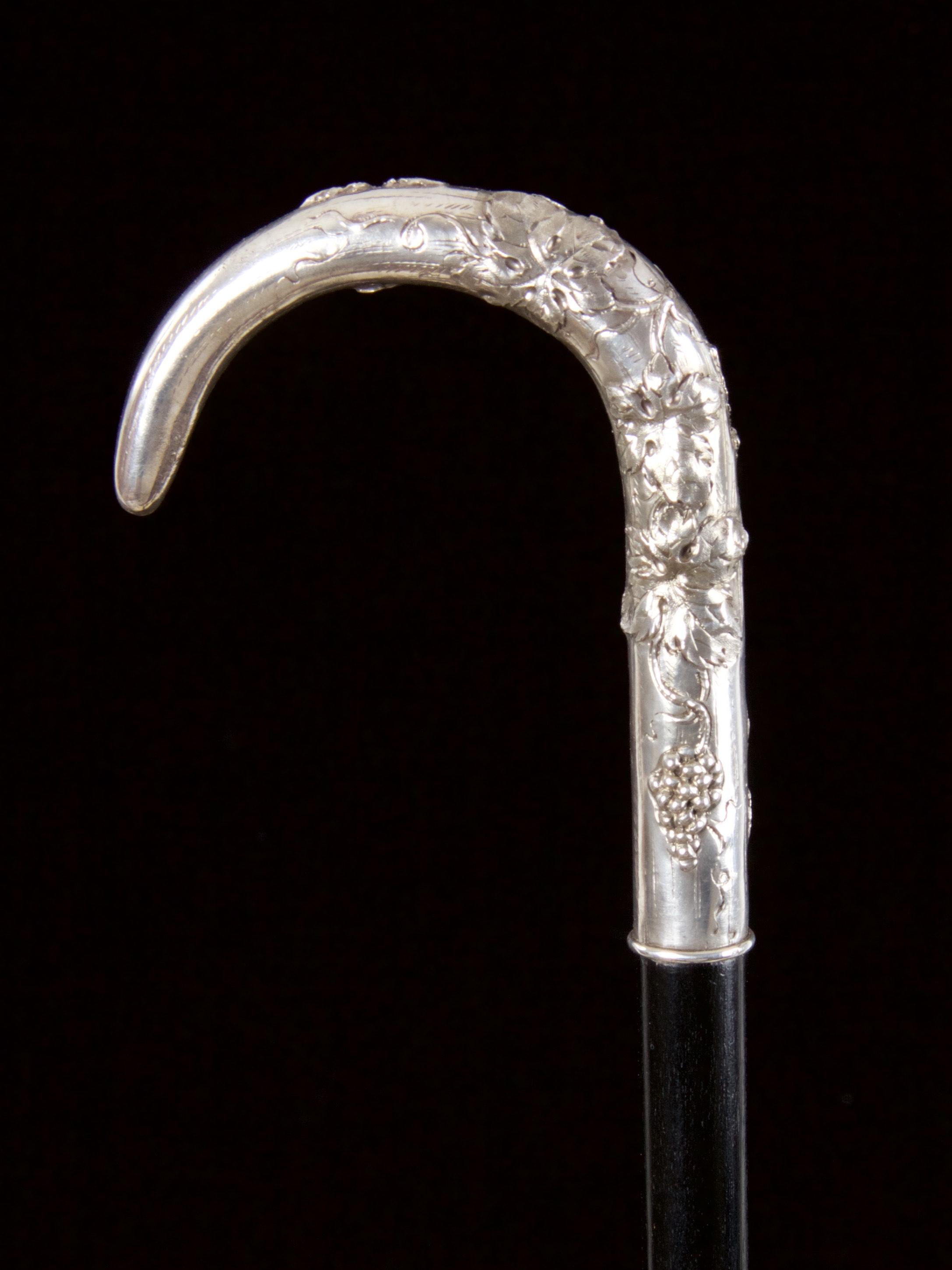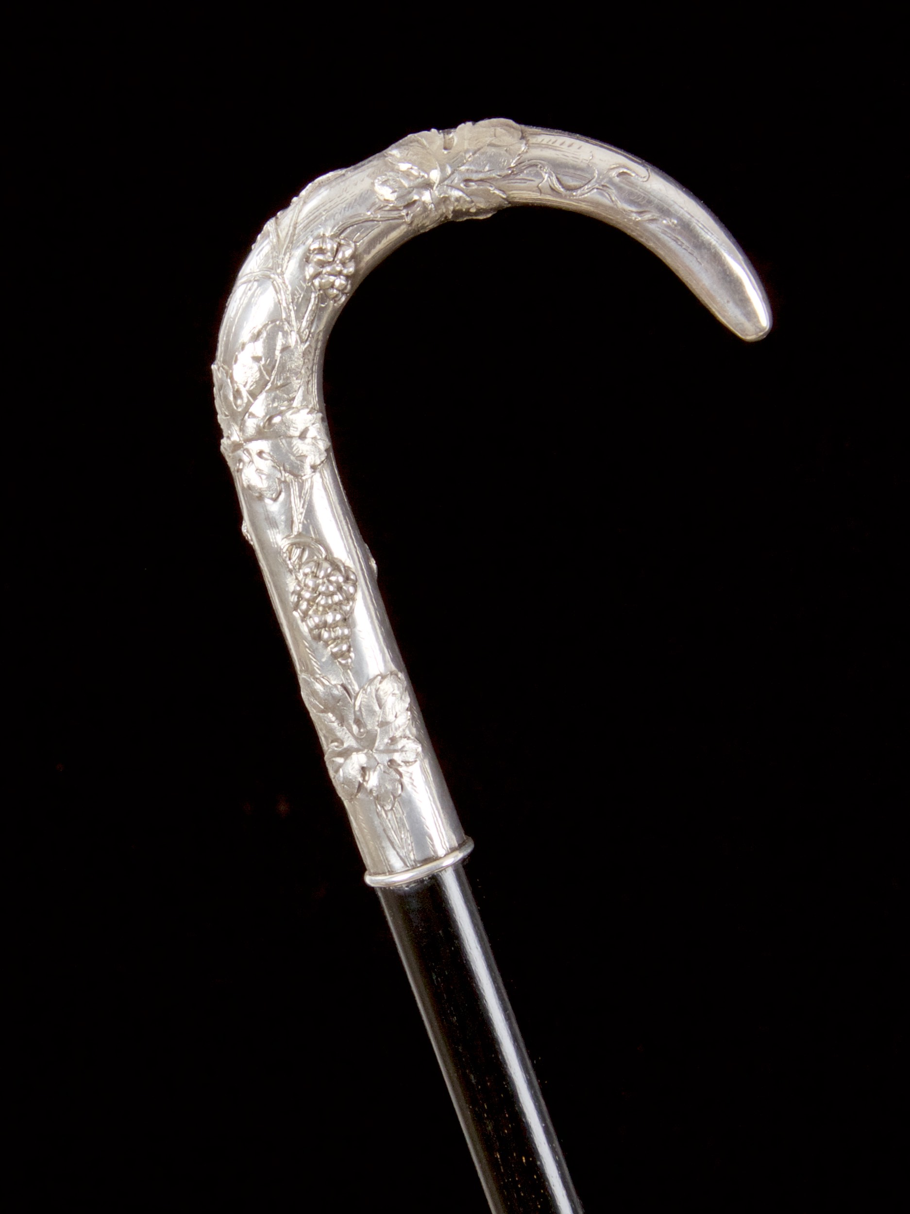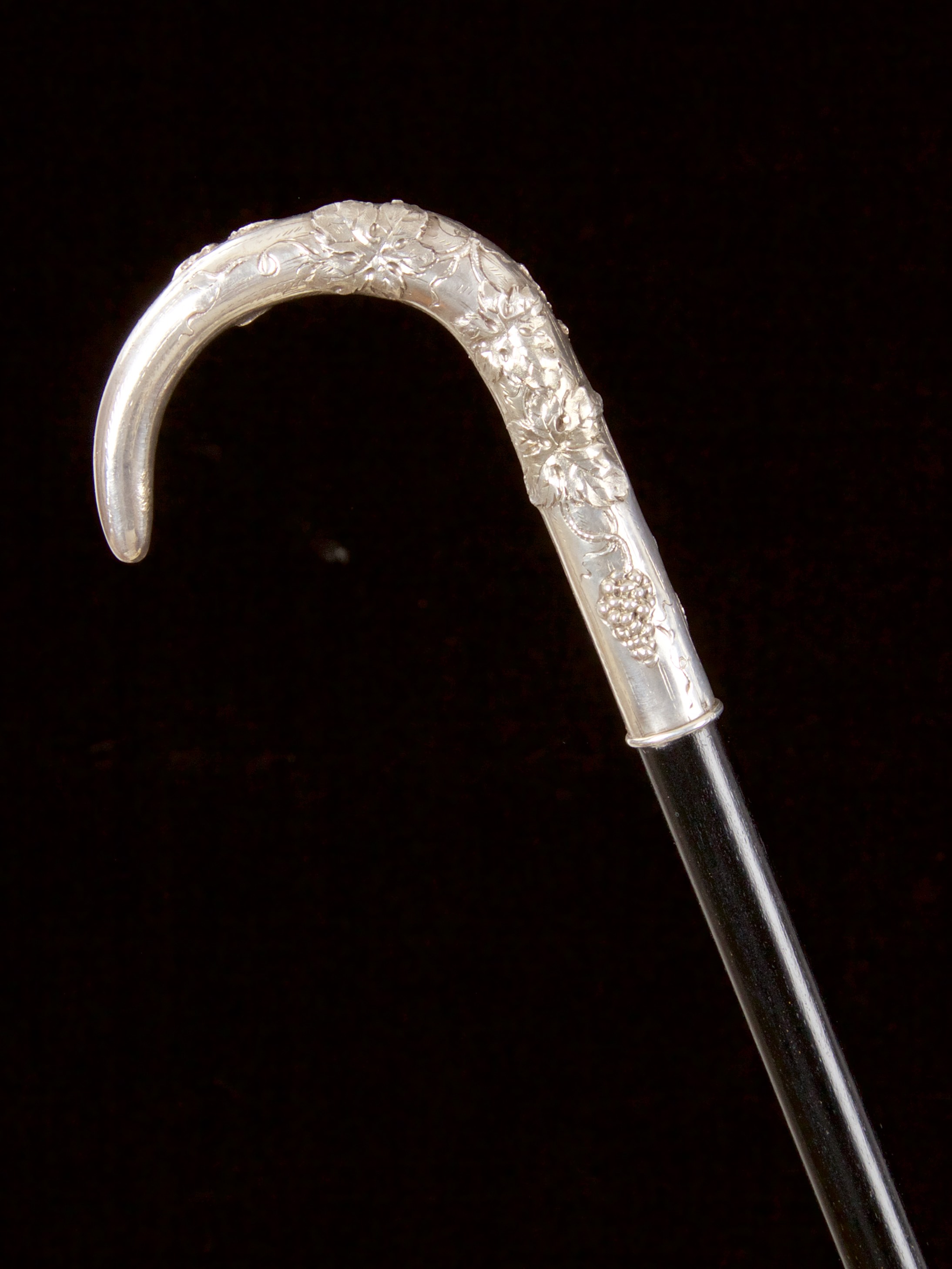 An attractive slim crook-shaped silver-handled cane - the handle with raised floral, vine and grapes decoration, in rich detail, mounted directly onto an ebonised hardwood shaft finished with a horn ferrule