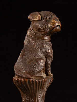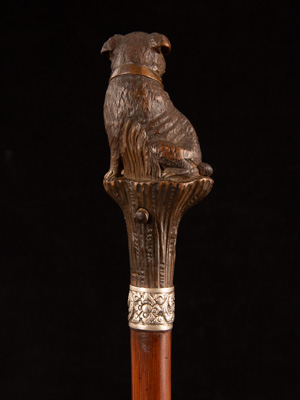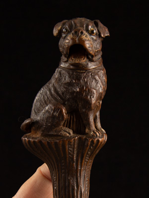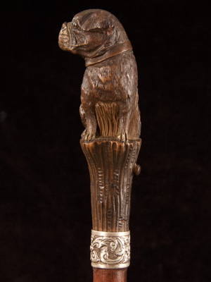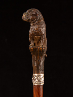 A good example of an automaton cane - the handle modelled and carved as a full, seated pug dog, with a typical push button mechanism, which when depressed moves the lower jaw of the dog, and further wags his tail! - the handle fitted with an embossed silver collar onto a stepped brown bamboo shaft