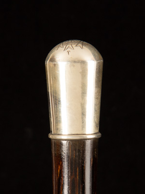 A plain silver knopp shape-handled cane - the handle with a domed top, engraved with the three letters "M C J", these being the original owner's monogram - the handle finished with a turned ridge design and fitted directly onto a brown hardwood shaft finished with a steel-tipped brass ferrule